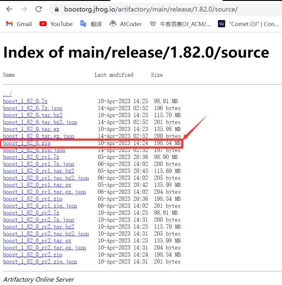 官网下载地址为 https://boostorg.jfrog.io/artifactory/main/release/1.82.0/source/,截至此博客发布时最新版本为1.82。笔者下载的版本是 boost_1_82_0.zip