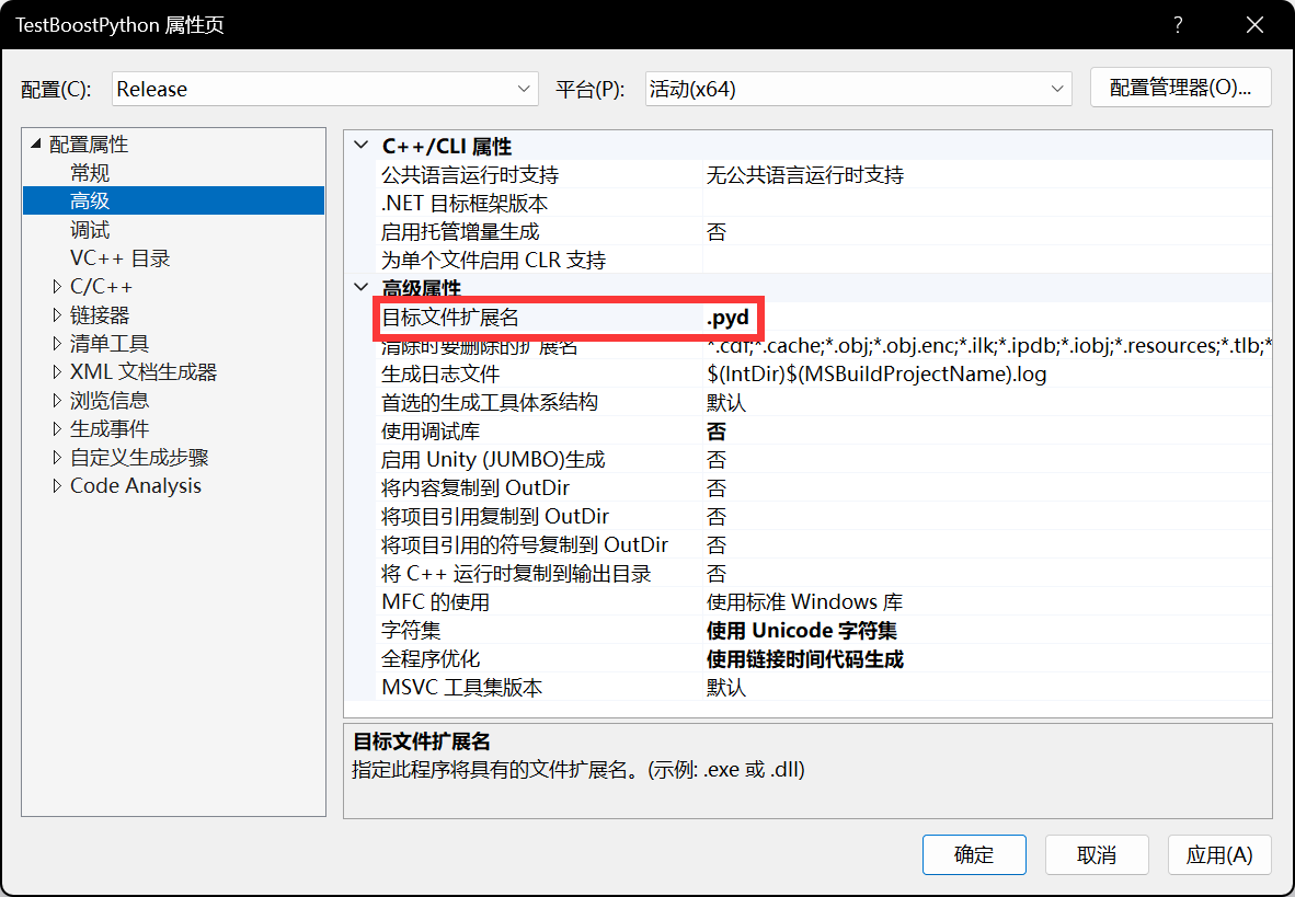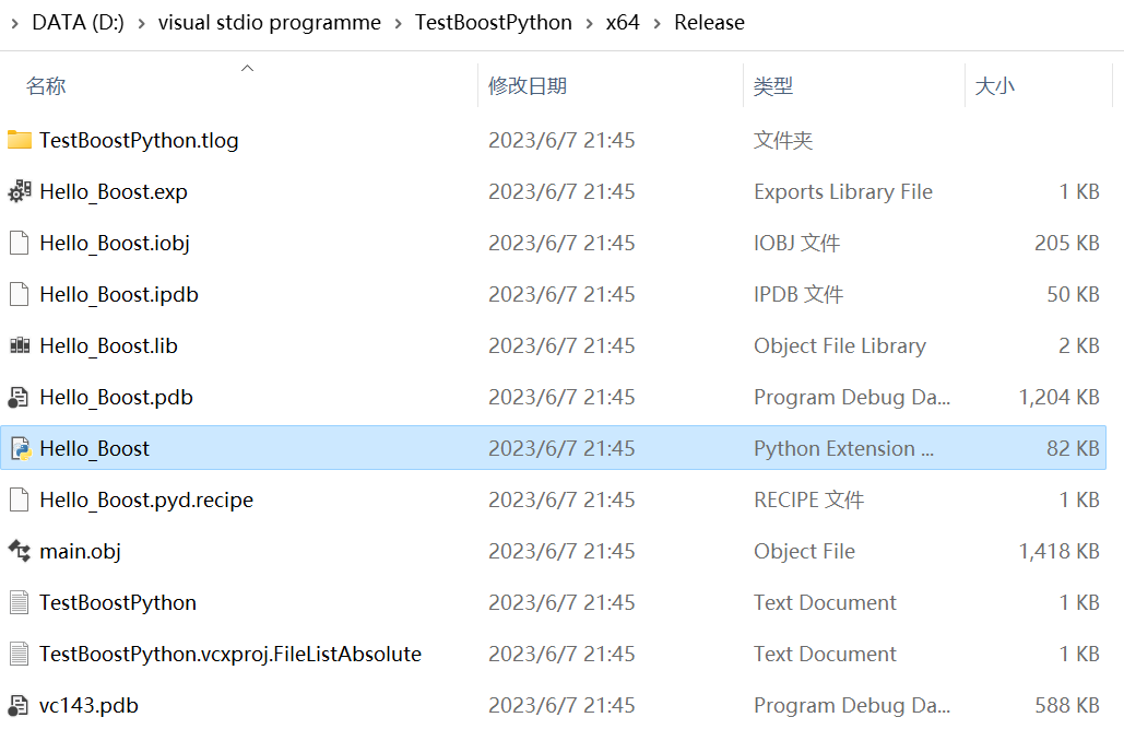 如果你执行的是 release,进入目录 file2project\\x64\\release\\,否则进入 file2project\\x64\\debug\\,你能看到一个文件 Hello_Boost.pyd,这就是刚才的 C++ 源代码生成的 Python 模块。