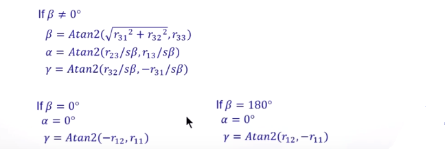 $$ \prescript{A}{B}{R}_{XYZ}(\gamma, \beta, \alpha) = \begin{bmatrix} c\alpha c\beta & c\alpha s\beta s\gamma - s\alpha c\gamma & c\alpha s\beta c\gamma + s\alpha s\gamma \ s\alpha c\beta & s\alpha s\beta s\gamma + c\alpha c\gamma & s\alpha s\beta c\gamma - c\alpha s\gamma \ -s\beta & c\beta s\gamma & c\beta c\gamma \end{bmatrix}